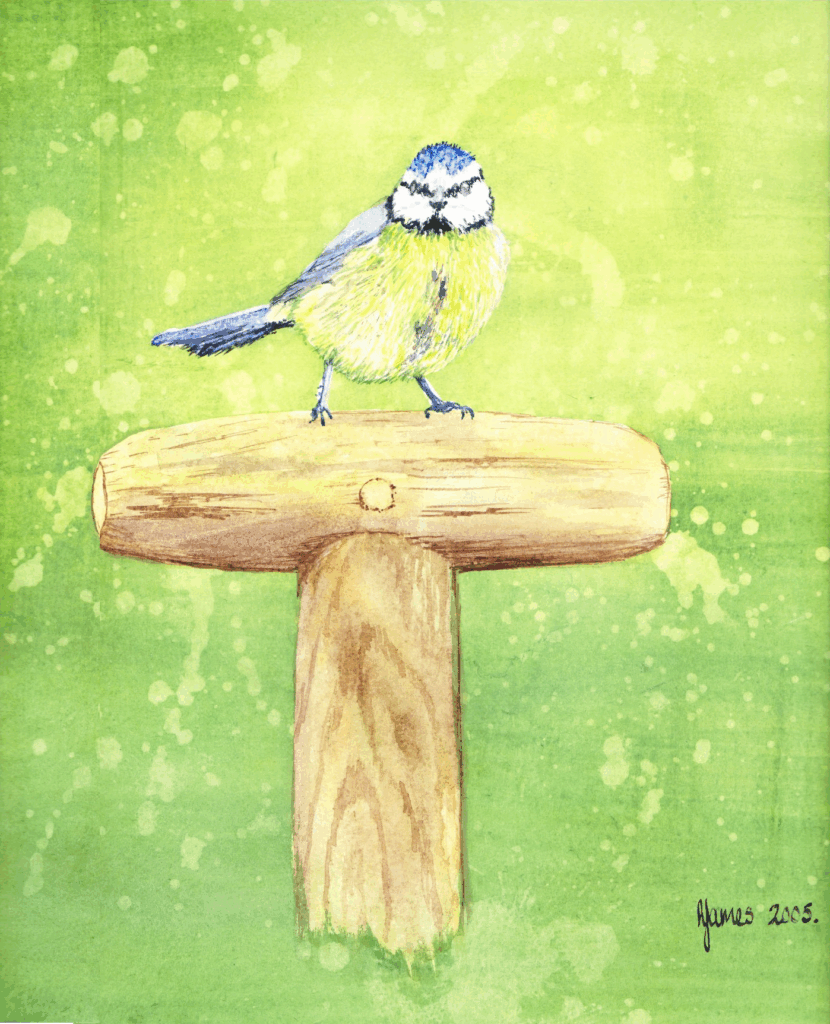 Inspired by all of the Blue Tit visitors to our garden, this painting is in watercolour and is mounted on an oval mount card highlighting the bird and shovel handle.